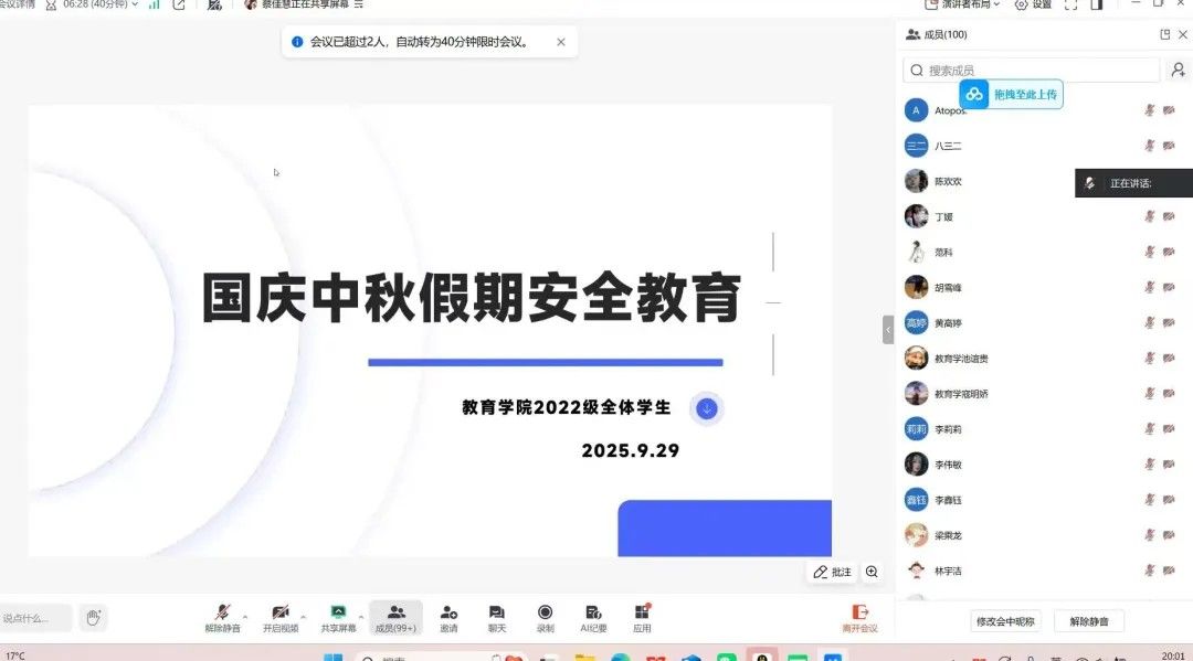 各年级辅导员组织各班围绕廉洁教育、开学第一课、感念师恩、国家安全开展了系列主题班会,引导学生树立廉洁意识、立志报国强国、弘扬尊师传统、增强国家安全观念。同时,辅导员在国庆节前开展了假期安全教育主题班会,提醒大家不断提升安全意识,平安度过假期。
