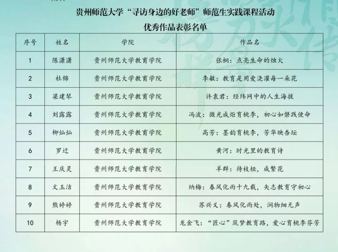 在第五届“寻访身边的好老师”师范生实践课程活动中,我院高度重视,精心筹备,积极组织学生寻访身边的好老师,我院学子以真实寻访、细心记录和动人书写展现了扎实的实践能力,共计10篇作品入选优秀作品,未来,我院将积极组织学生参与“寻访身边的好老师”活动,弘扬教育家精神,助推未来教师群体专业素养发展,共动新时代好老师成长与发展。