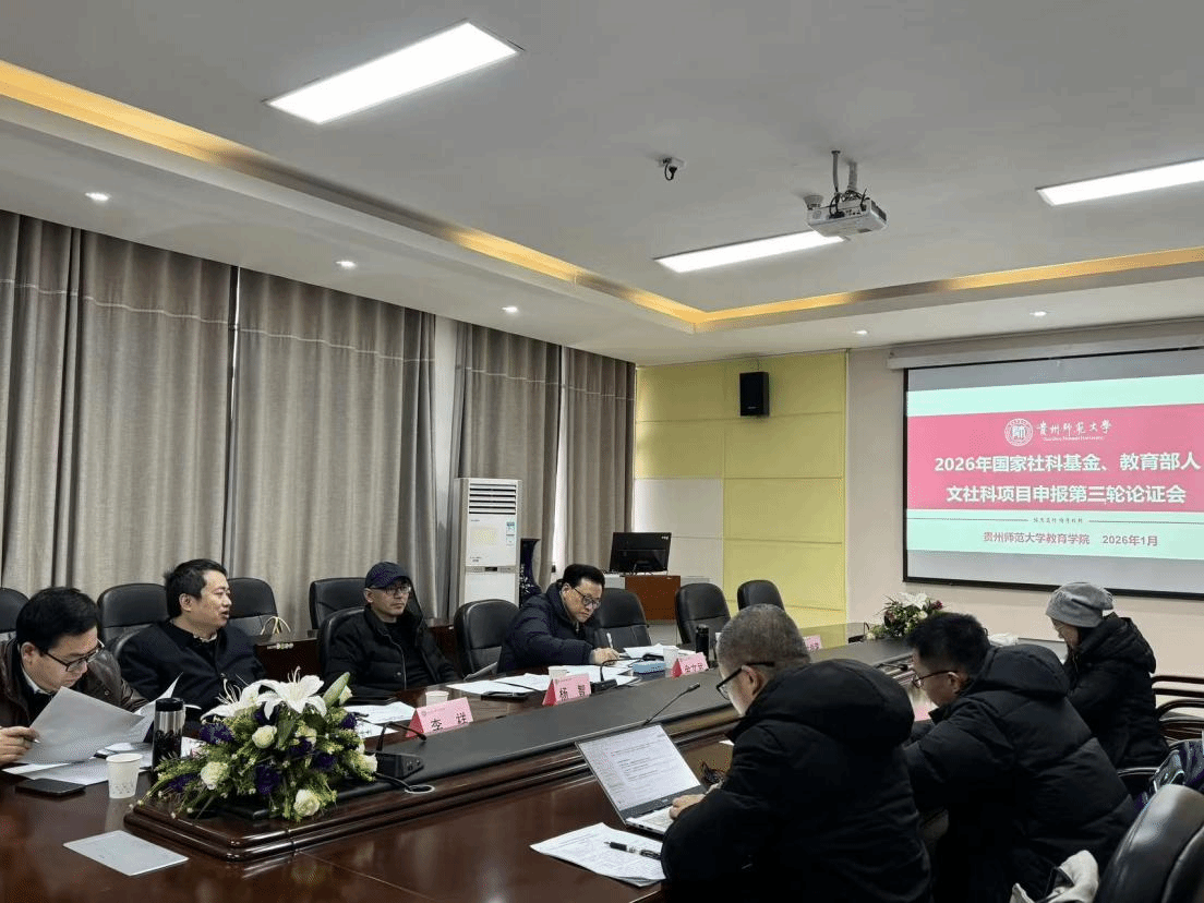 1月7日上午,教育学院2026年度国家社科基金、教育部人文社科研究项目第三轮论证会在学院三楼会议室举行。由贵州师范学院教务处副处长杨智教授,贵阳学院教育科学学院余文武教授,以及我院农村教育学学科负责人李旭教授、贵州省家庭教育指导中心主任李祥教授组成的专家组,为学院拟申报课题的多名教师提供详细辅导。会议由教育学院副院长杜尚荣主持。