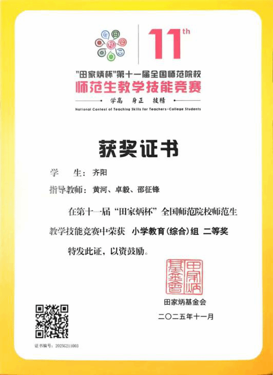 三尺讲台,一方天地;以赛促学,砺教笃行。11月28日至30日,第十一届“田家炳杯”全国师范院校师范生教学技能竞赛决赛于浙江师范大学成功举办。我院2022级小学教育专业学生齐阳凭借扎实的专业功底、精巧的教学设计和沉稳的现场发挥,荣获小学教育(综合)组二等奖,充分展现了我院学子全面的学科素养和昂扬向上的精神风貌!